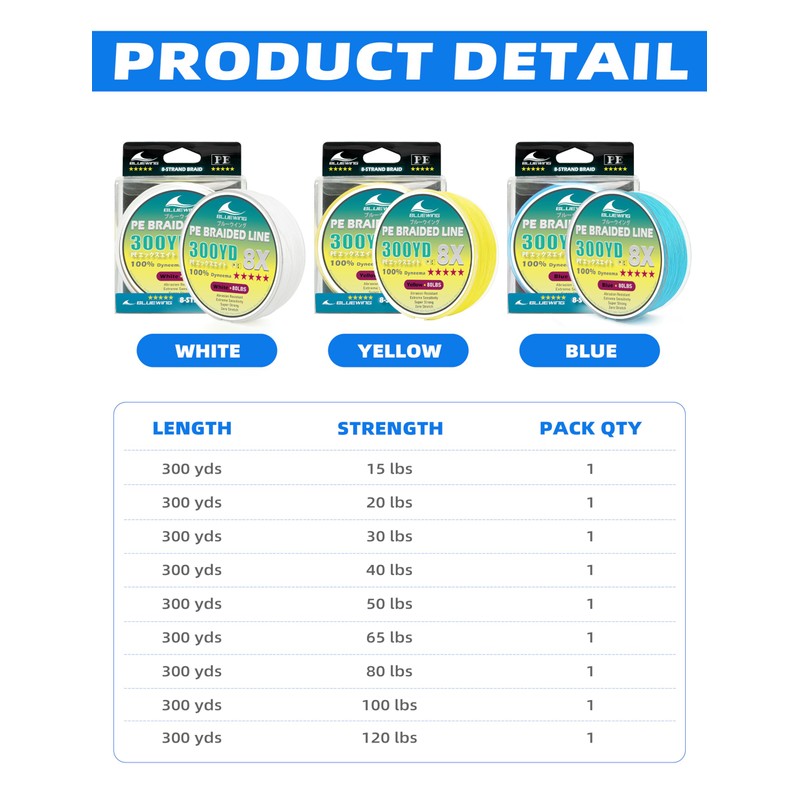 - Versatile Fishing Line: Our braid fishing line offers tensile strengths ranging from 15 to 120lbs. Whether you're fishing in freshwater or saltwater, targeting small trout or hefty marlins, our line has you covered.