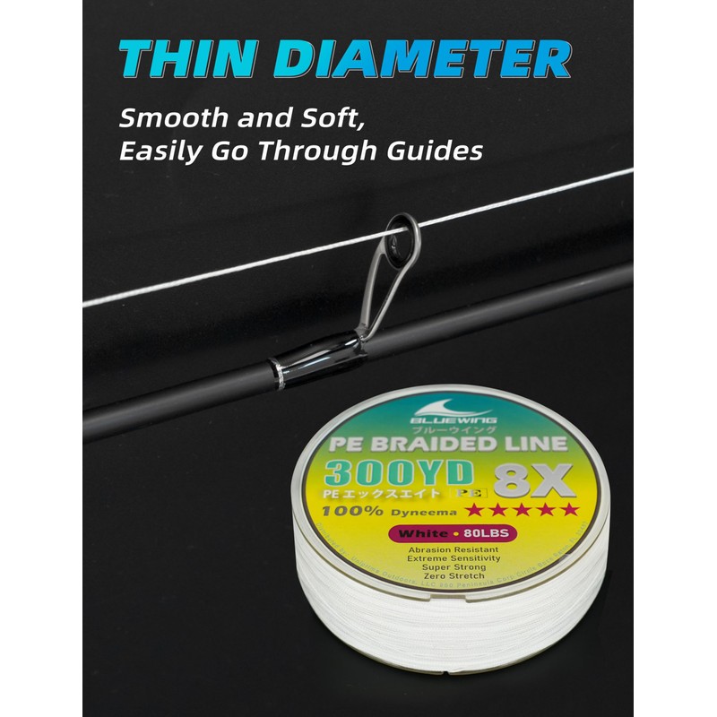 BLUEWING Braided Fishing Line 8 Strands PE Braid Fishing Lines Thin Diameter & Abrasion Resistant Fishing String for Saltwater Fishing 20LBS 300YD White
