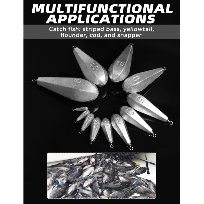 - Multifunctional Applications: This fishing weight is suitable for catching any size fish such as striped bass, yellowtail, flounder, cod, and snapper in shallow to medium-depth coastal waters.