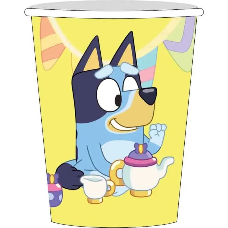 Dress your table with our Bluey Printed Cups! Our printed cups are paper with a wrap around print.They are suitable for hot and cold liquids, perfect for refreshing party drinks and even sweets! Package includes 8 cups, with a 266ml capicity. Perfect for your child’s party!