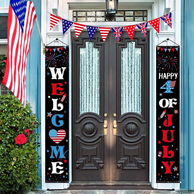 - Patriotic decoration set: 1 x "Welcome" banner, 1 x "Happy of 4 of July" banner; The patriotic banners for porches are designed with American flag, star and stripe, etc.; Nice to decorate Independence Day party