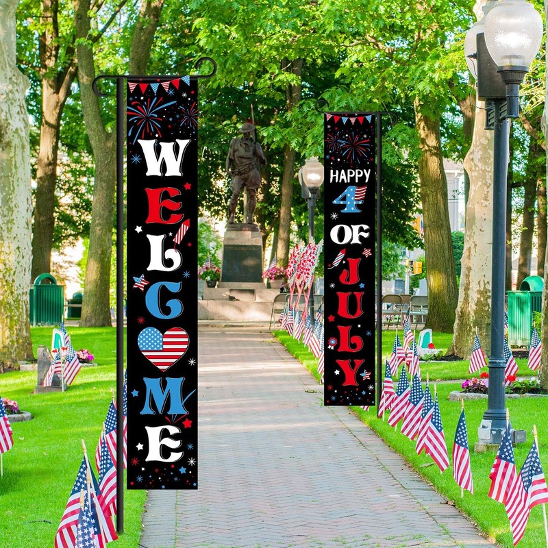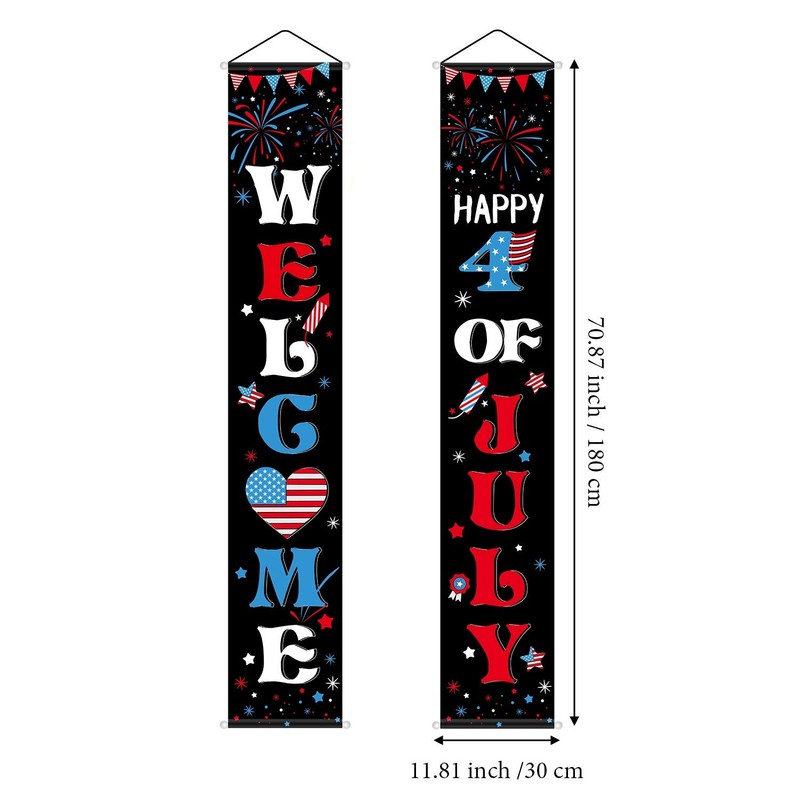 - Patriotic decoration set: 1 x "Welcome" banner, 1 x "Happy of 4 of July" banner; The patriotic banners for porches are designed with American flag, star and stripe, etc.; Nice to decorate Independence Day party