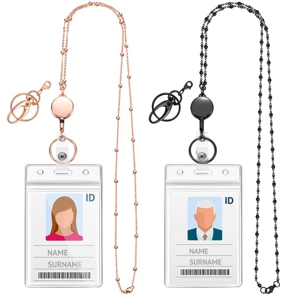 Blulu 2 Styles Sets Women Beaded Lanyard with ID Holder Retractable Badge Reel Stainless Steel Chain Necklace with 2 Water Resistant Name Badge Holder Clip (Black, Rose Gold)