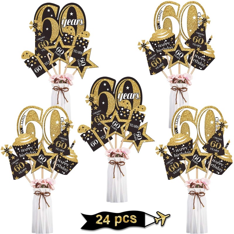 - Package includes: the gold 60th birthday party centerpiece sticks includes 24 pieces cards in 6 different shapes, like gift box, star, cake, etc, 24 piece wooden dowel sticks and 60 piece non-trace glue points, which can satisfy your decoration needs