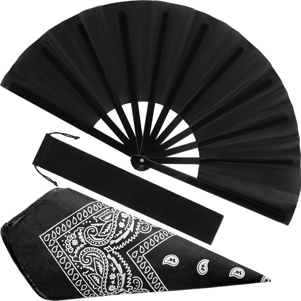 Blulu Large Chinese Folding Fans for Line Dancing with Bandanas Paisley Print Big Silk Handheld Clapping Popping Fans Novelty Headband Cowboy Bandanas for Men Women Boots on The Ground (Black)