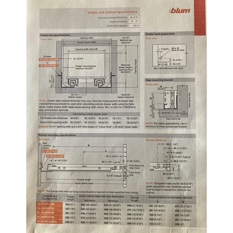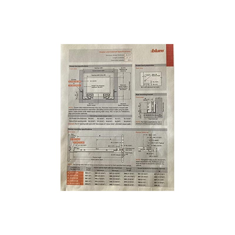 Discover Blum Tandem plus Blumotion (soft-close) Complete Pair. With100 lbs static load-bearing capacity, full extension and soft closing. The drawer slide can be four-dimensional adjusted and has elongated holes for depth adjustment & bottom mount holes that allow you to mount the slide to a shelf or the bottom of the cabinet. Blum Tandem fits 1/2" - 5/8" drawer side thickness. The Complete Pair is supplied with 2 563H4570B (left and right), 2 T51.1801 locking devices (left and right), 2 rear brackets (needed for face frame only application) and screws.