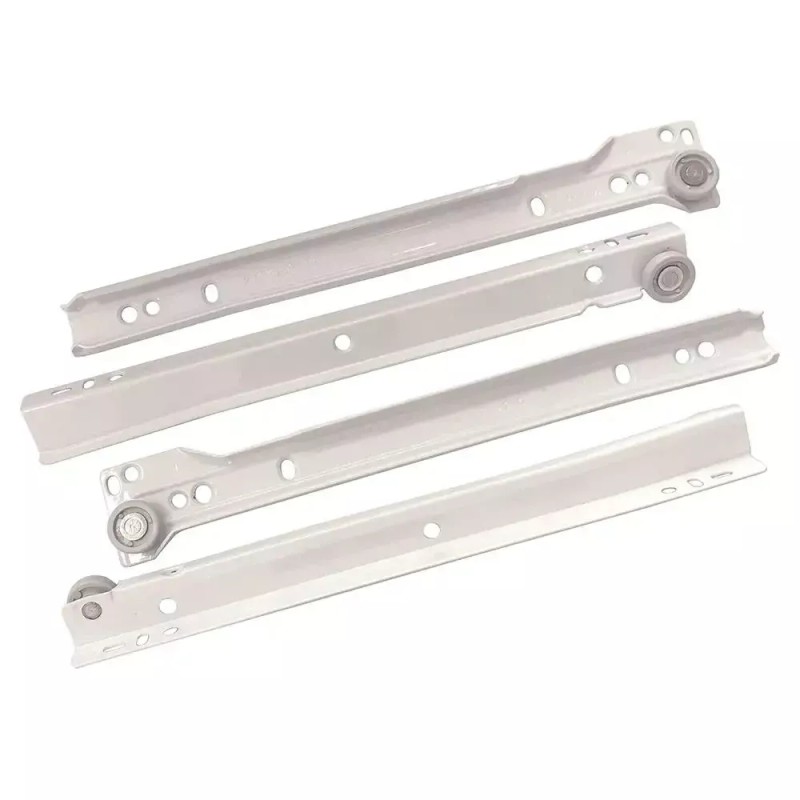 10" Blum 230M 3/4 extension epoxy coated self-closing drawer slides. Feature 100 lb. load rating, smooth running synthetic rollers.