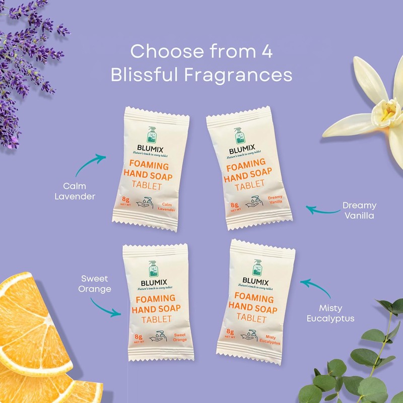 • A Treat For Your Senses - Each pack has six foaming hand soap tablets which equals 6 bottles of hand soap! Available in four blissful scents to choose from: Calm Lavender, Misty Eucalyptus, Dreamy Vanilla, and Sweet Orange. Enjoy a refreshing experience every time!