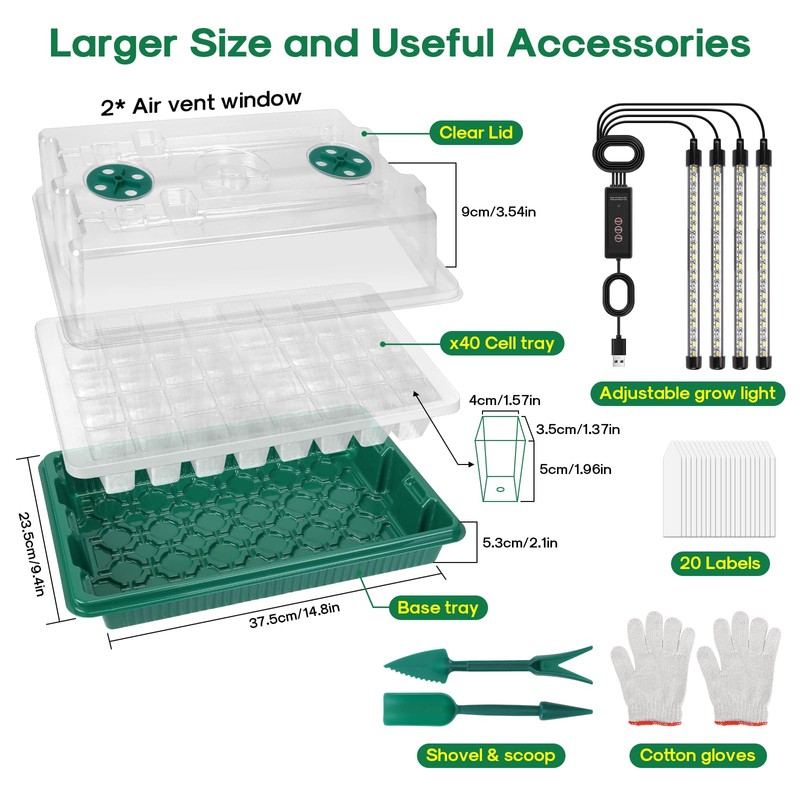 - 360Spectrum Seed Starter Tray With Grow Light Larger grow light cover spectrum for better seedling grow, the seed started kits have 4 full spectrum strip seed grow lights insert on the Dome of the garden plant starter kit. Now you can adjust and timed the light as you need! Withe& blue Light will help seedling growing faster and better. You can use this product by USB port or just plug-in,3 lighting modes & 3 timing functions (3H/6H/12H) & 5 brightness modes, the best tool for your garden