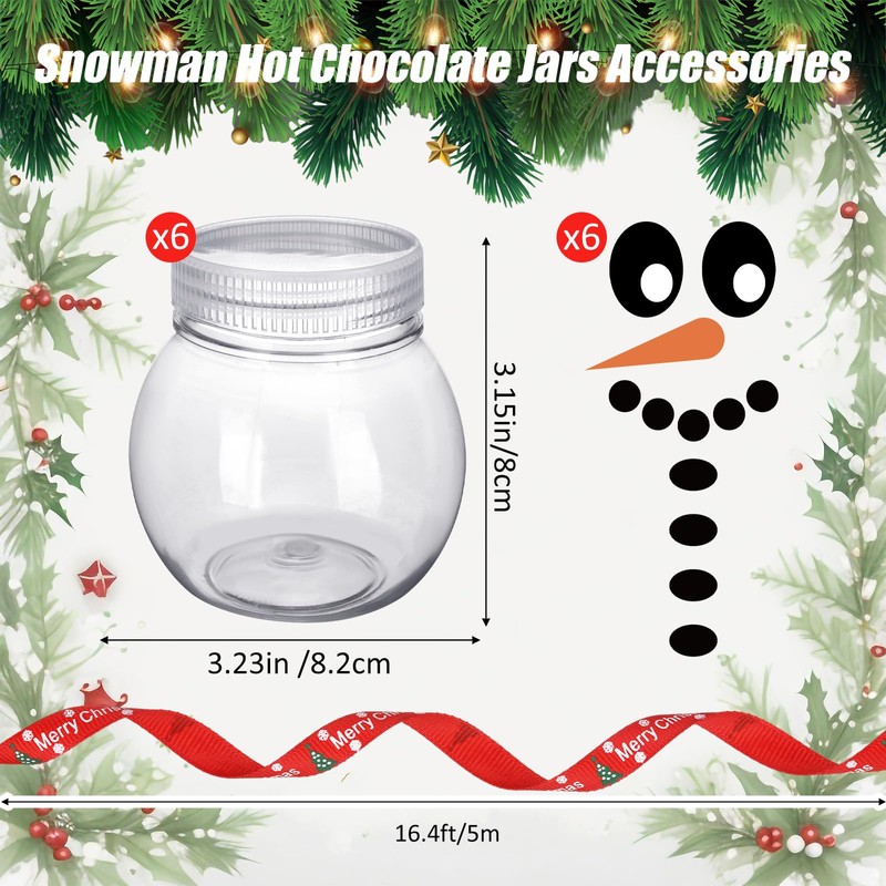 - Christmas Snowman Hot Cocoa Supplies: each Christmas hot cocoa jars set includes 6 round plastic cans with lids to meet your storage needs, and comes with 6 Christmas bows, 6 snowman stickers, 3 large flat pockets, and 1 roll of Christmas themed tied ribbon; Our set has abundant accessories and sufficient quantities to provide a complete hot cocoa party set