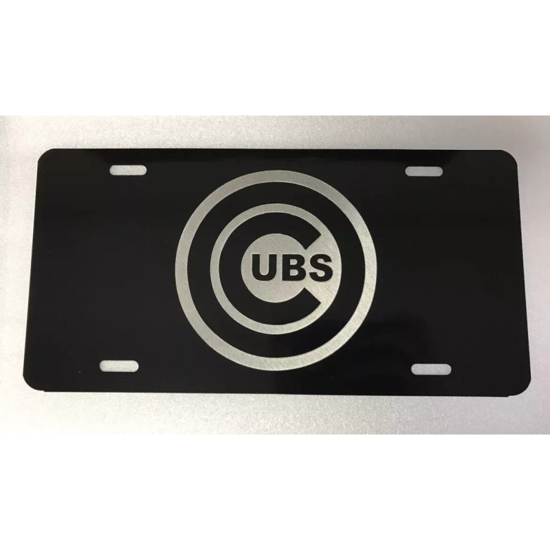 CHICAGO CUBS Logo Car Tag Diamond Etched on Black Aluminum License Plate.