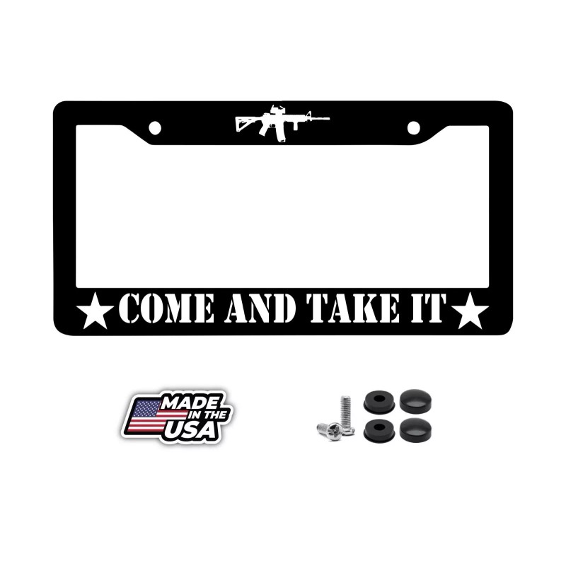 Show your support for the 2nd Amendment with this Black License Plate Car Frame from BLVD. Made of high-quality plastic, this license plate frame can be used for both front and rear placement on your vehicle. The design features the iconic "Come and Take it" slogan, making it a great addition to any gun enthusiast's collection. The frame fits standard size license plates and is easy to install. Perfect for anyone who wants to express their support for the right to bear arms.