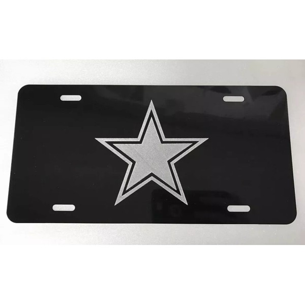Dallas Cowboys Star Car Tag Diamond Etched on Black Aluminum License Plate.