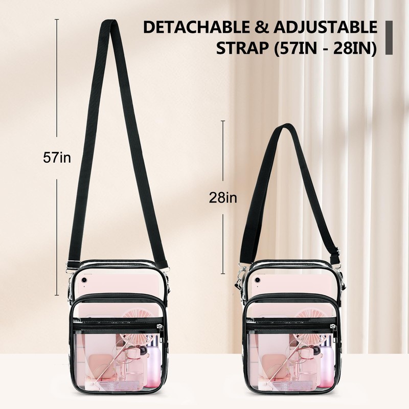 - Adjustable Shoulder Strap: The shoulder strap is made of quality nylon. You can easily adjust the shoulder strap for different styles like a clear crossbody bag and shoulder bag. The length can be adjusted from 28 in to 57 in.