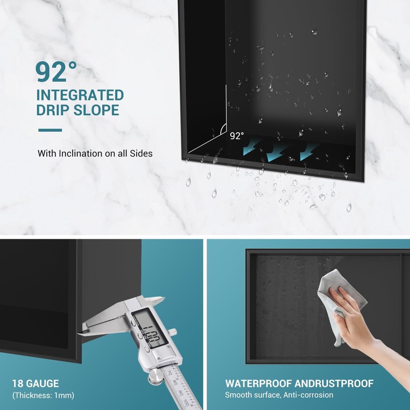 • HEAVY-DUTY, PREMIUM CONSTRUCTION: BLYLUND shower niche is made of 18G SUS304 stainless steel, thickness of 1.2MM, strong and durable. Waterproof, corrosion-proof, rust-proof and durable, far superior to XPS foam, lightweight plastic or fiberglass mesh. Life can be up to 10 years or more