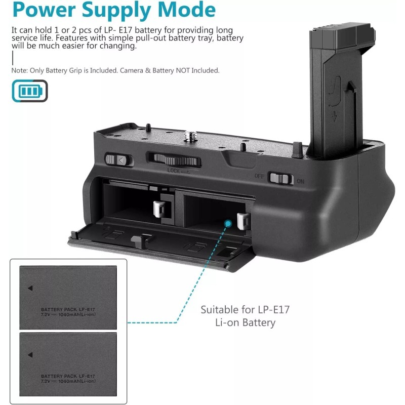 - Battery cartridge plate holds 1 or LP-E17 Lithium Ion batteries