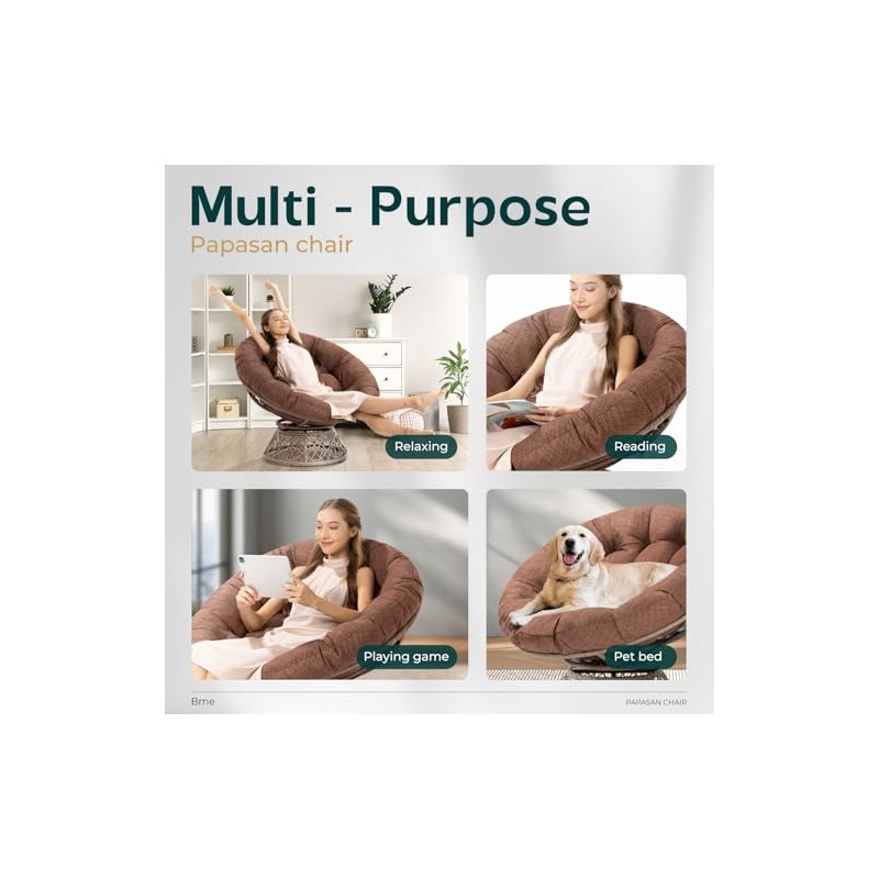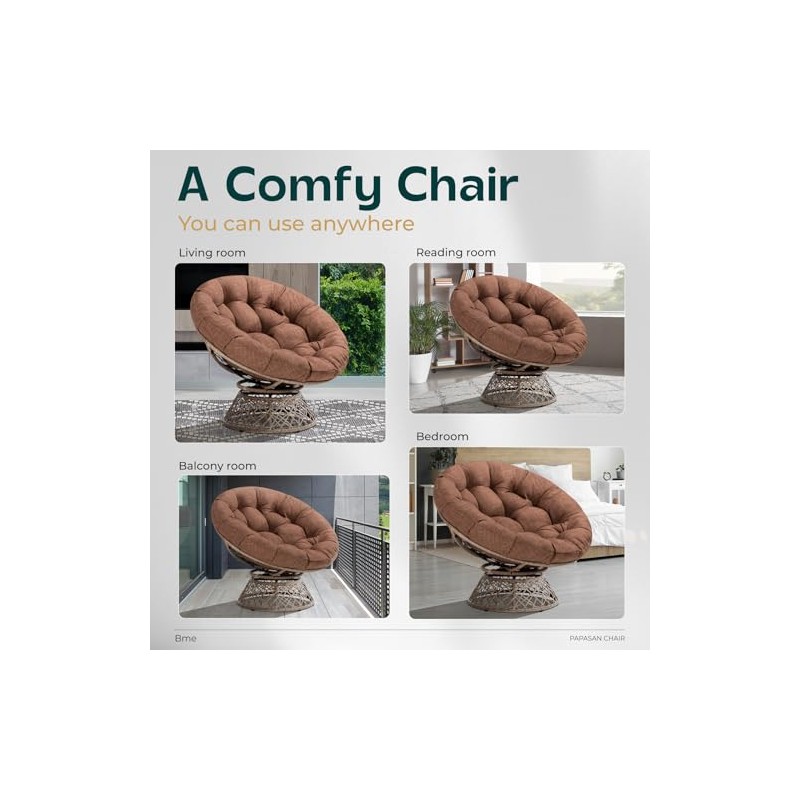 Bme Cinnamon Mocha - Brown Base 40" Ergonomic Wicker Papasan Chair with Soft Thick Density Fabric Cushion, High Capacity Steel Frame, 360 Degree Swivel for Living, Bedroom, Reading Room, Lounge