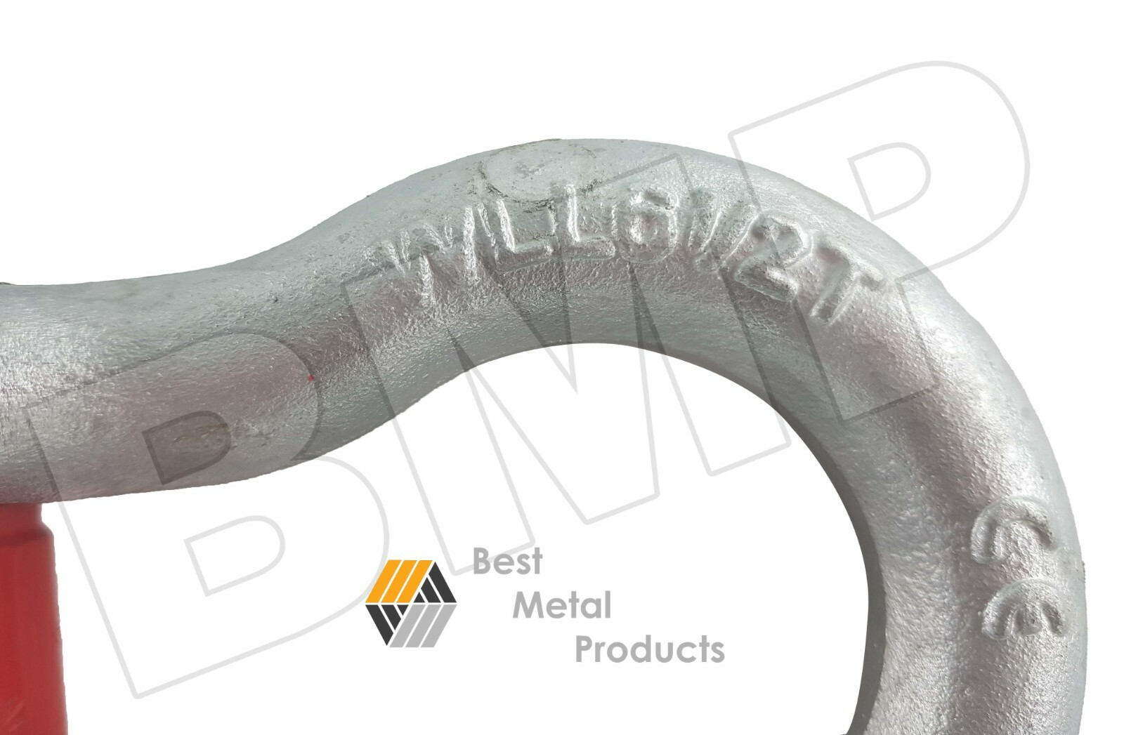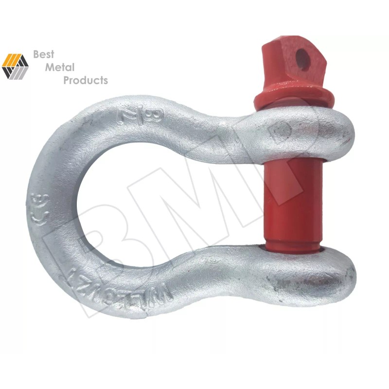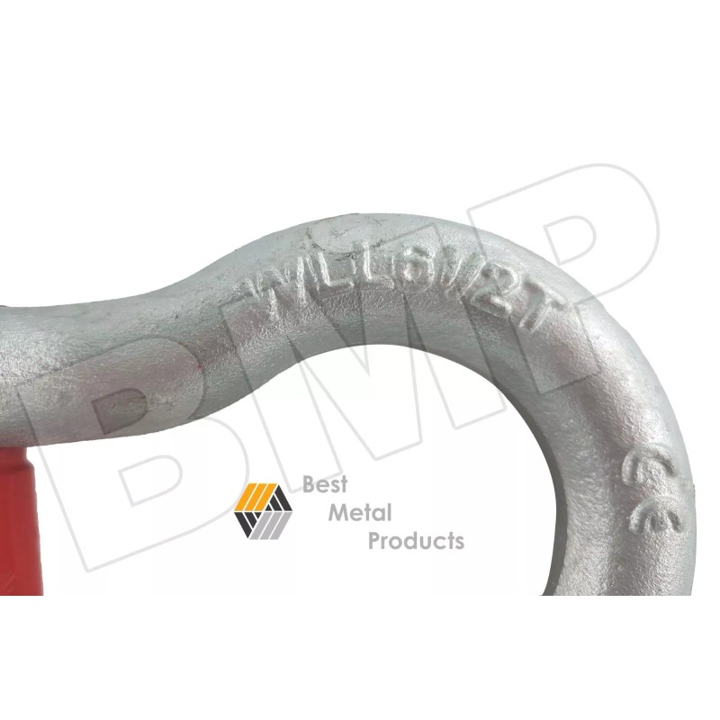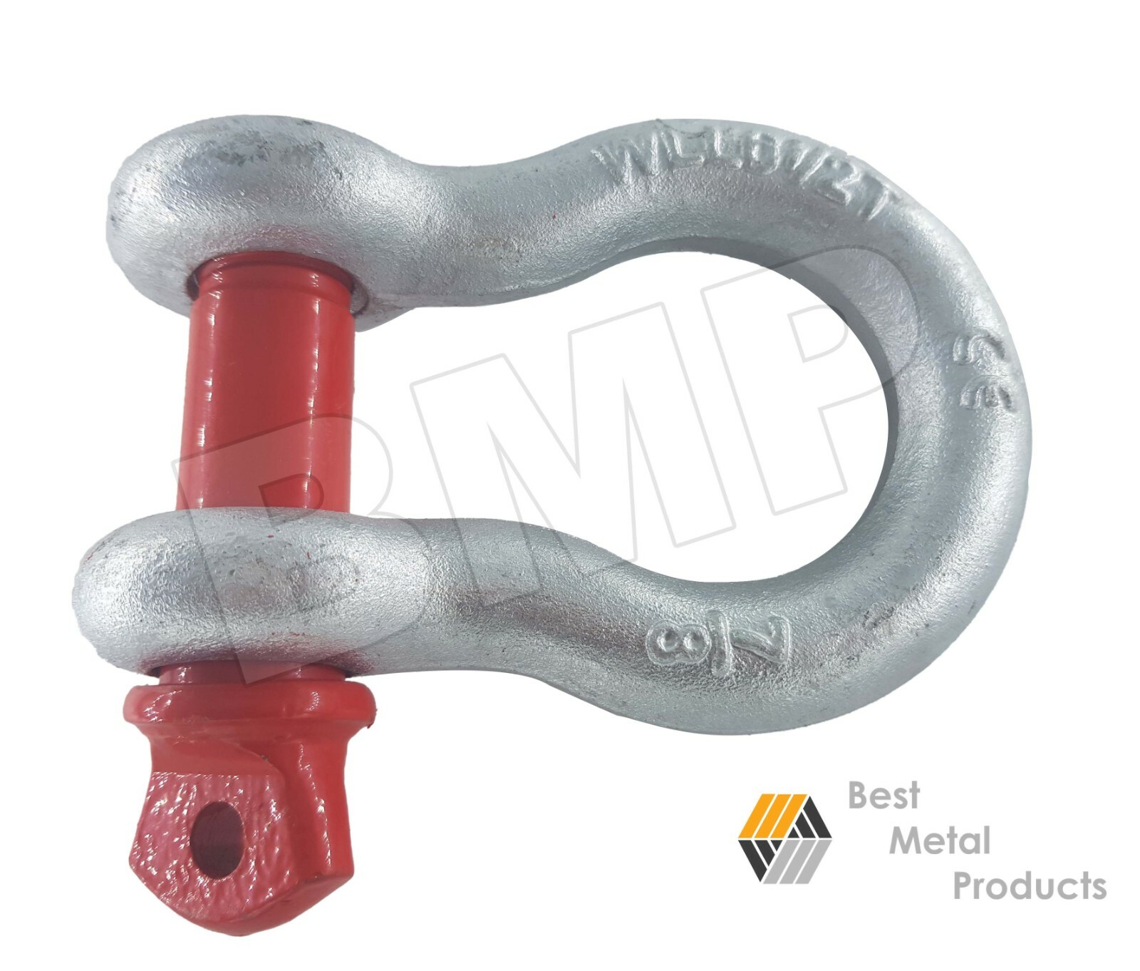 This product is made out of grade 209 forged steel, and has electroplated zinc. This shackle also has a red screw pin. The WLL is 6.5 tons, that is equal to 13,000 lbs.