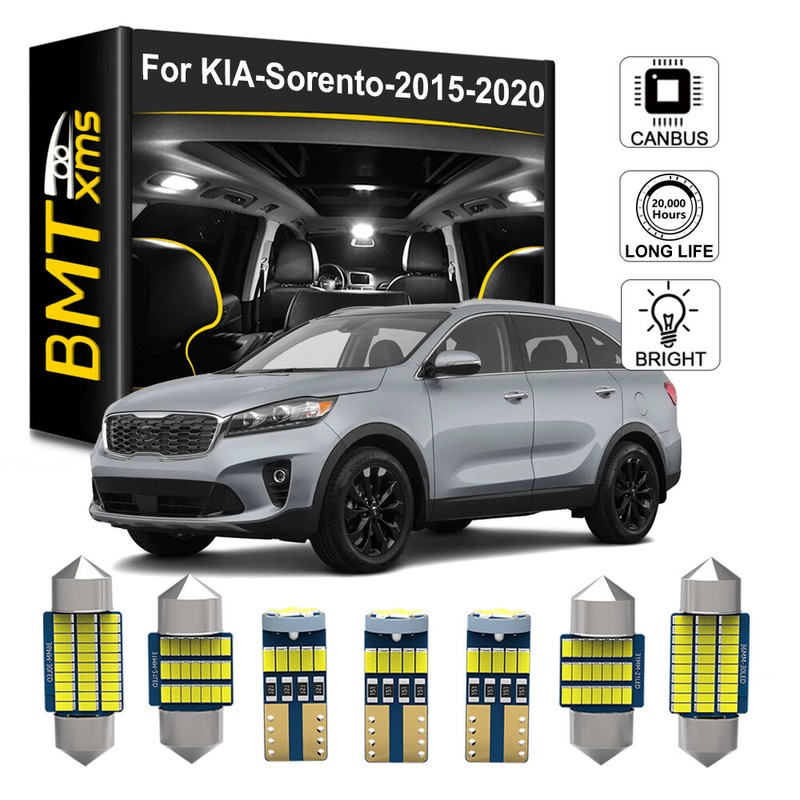 11Pcs Interior LED Lights Package Kit for Kia Sorento UM (2015-2020) Map light (2 pieces) Dome light (1 piece) Vanity Mirror Light (2 pieces) Glove Box Light (1 piece) Trunk Light (1 piece) Spare Light (2 pieces)