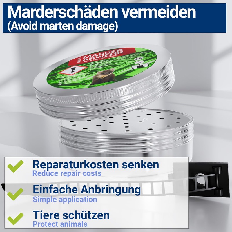 - [EFFEKTIVER & SOFORTIGER MARDERSCHUTZ] Marder sind territorial und verteidigen ihr Revier mit gro?er Aggressivit?t. Um andere Artgenossen fernzuhalten, setzen sie einen spezifischen Duft ein, der Gefahr signalisiert. Mit dieser Anti Marder Duft-Dose k?nnen Sie einen natrlichen Marker nutzen, um Ihr Fahrzeug zu sichern. Vermeiden Sie Reparaturkosten, wie durch Bisse an Kabeln.