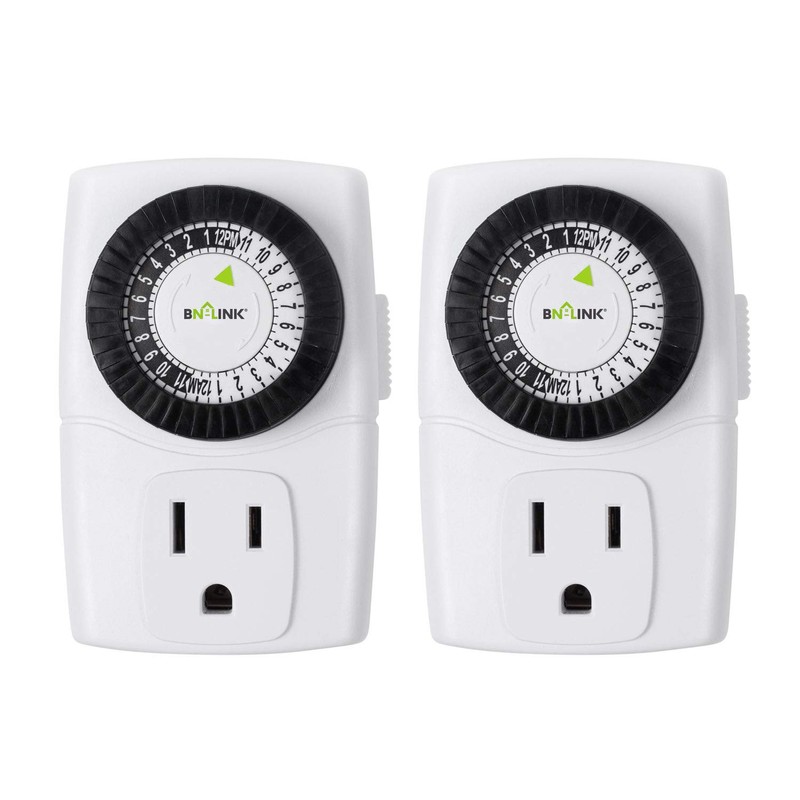 BN-LINK Indoor 24-Hour Mechanical Outlet Timer with 3 Prong turns indoor lighting on and off at set times. Package includes 2 mini timers that can be used in two locations, which will give your home that lived-in look while you’re away. This plug-in timer provides up to 48 on/off settings per day and the cycle repeats every 24 hours. Easy to set in 30-minute intervals with segment pins that can easily push down or up. Use the manual override button to turn the timer on or outlet on, so you don't have to delete any preprogrammed settings. The compact design fits the bottom outlet without blocking the outlet above. Plug fans, lamps, or holiday lights in and set the timer to turn the device on and off so it won't remain on when unused. This timer provides safety and security as you come home to a lighted house. No fumbling for the light switch or tripping over obstacles in your way, the lights are on when you walk in the door. This timer is compatible with compact fluorescent lighting, LED bulbs. The BN-LINK Timers bring simplicity to your life, by maximizing convenience, security, and energy savings.