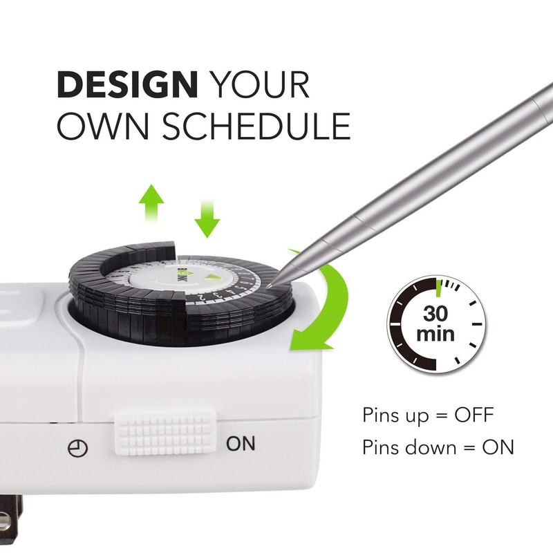 - DESIGN YOUR OWN SCHEDULE: With up to 24 on and off settings per day, you can program your devices to turn on/off in as small as 30-minute intervals. Settings will repeat daily once programmed and plugged-in.