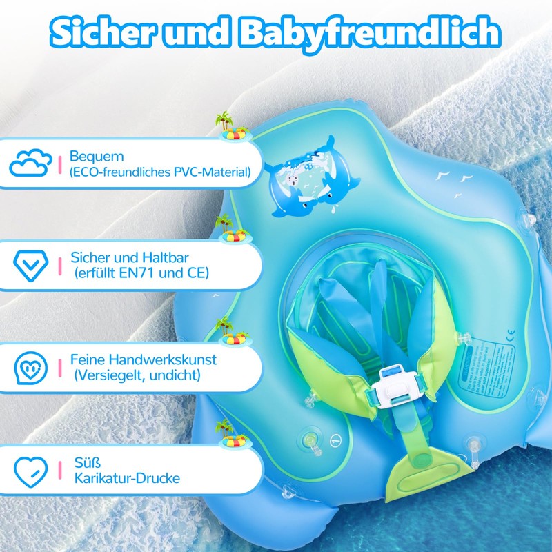 - Safe Materials & Comfortable Experience The baby buoy is made of sturdy and environmentally friendly PVC material, which is non-toxic, pollution-free, durable, soft and comfortable for baby's sensitive skin. The baby float is equipped with two separate air chambers on both sides that support the baby's stomach and provide a more comfortable swimming experience