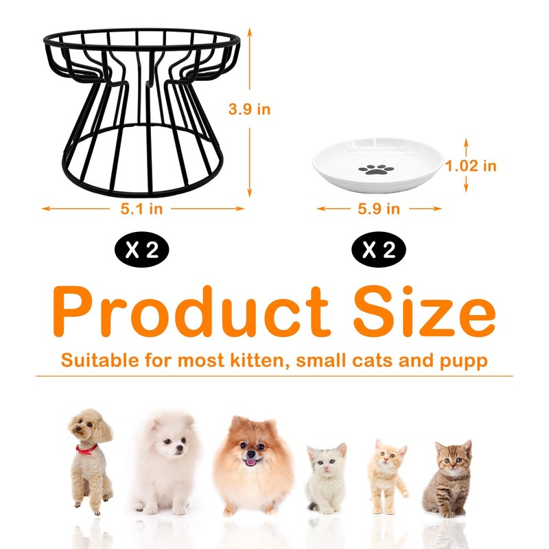 - 【2 Pack Elevated Cat Bowls】Bowl set includes 2 food dishes for wet food and 2 sturdy metal stands, plenty to easily meet your cat's daily needs and replacements. The 6-inch wide cat dishes are suitable for small cats or short-legged breeds such as Napoleon cats, Munchkin cats, also known as Dwarf cats, Pygmy cats, and Sausage cats.