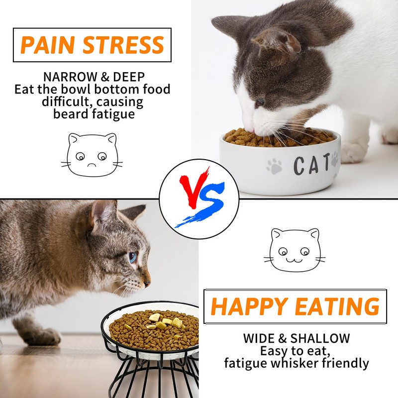- 2. The widened shallow mouth design of the cat food bowl allows cats to eat easily without touching their nose or whiskers and causing discomfort. Prevent whiskers from growing and keeping them clean.