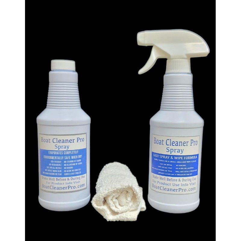 The BCP Spray Combo Kit is a new take on the original Boat Cleaner Pro formula. The BCP Spray Combo Kit includes a 16 oz bottle with an attachable spray nozzle, one 16 oz refill bottle, and a cloth towel. BCP Spray is perfect for quickly cleaning stubborn spots and heavily soiled surfaces in and around your boat. BCP Spray will not harm the gel coat or teakwood.
