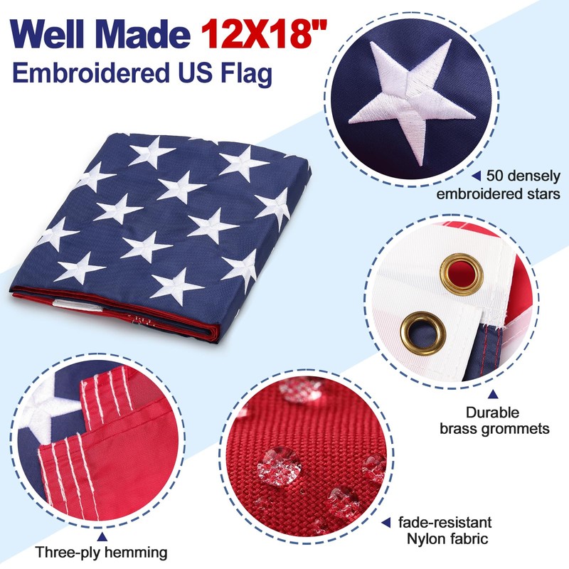 - Premium Marine American Flag: This beautifully embroidered 12x18" US flag is crafted from 240D heavy-duty polyester with dense stitching and sturdy brass grommets; Designed for durability, it flies gracefully in any wind conditions, ensuring consistent visibility and a lasting presence