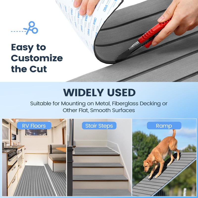 - 【EASY CUSTOMIZED CUTTING】Please use scissors or a hobby knife to cut the boat carpet waterproof into various shapes and sizes of segments to fit your boat's hull. Then, simply tape the segments to the areas that need traction or protection.