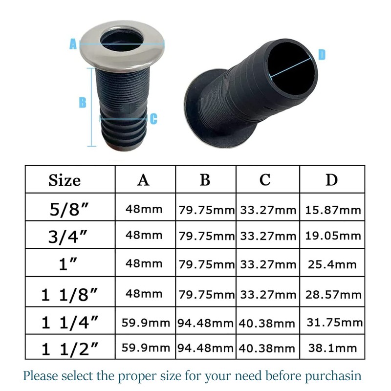 Boat Nylon Stainless Steel Thru-Hulls, Heavy Duty Scupper Drain for 5/8 Inch, 3/4 Inch, 1-1/8 Inch, 1-1/4 Inch or 1-1/2 Inch Hose Diameter for Bilge Pump, 1-1/4 Inch (31.75 mm)