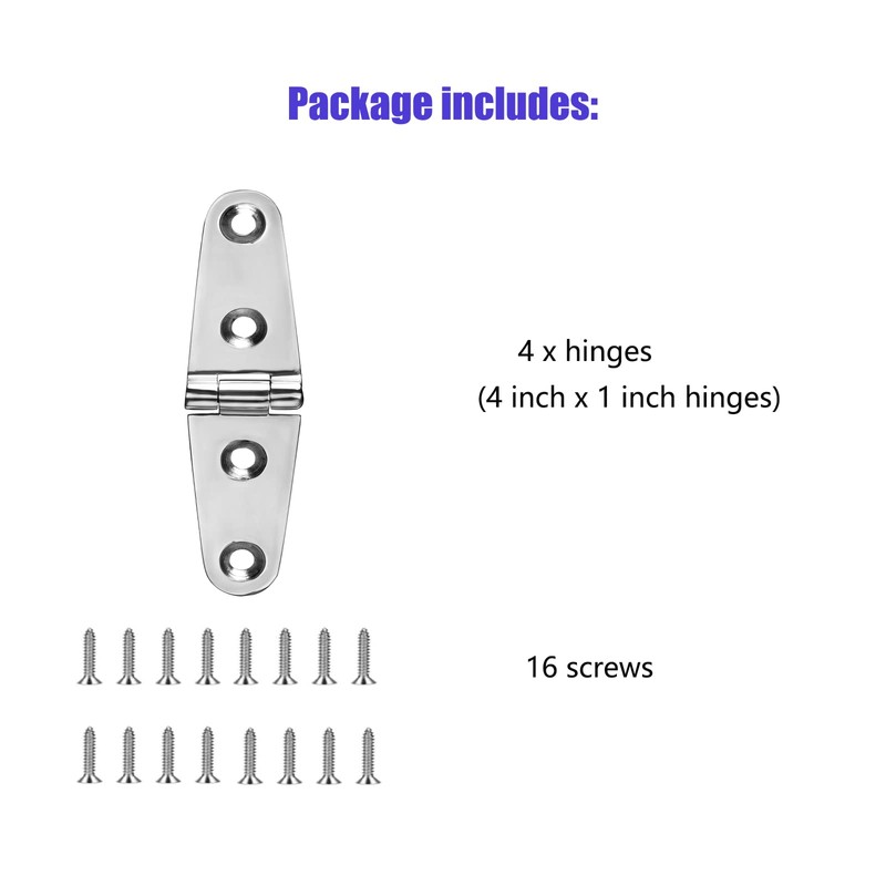 Package includes: 4 x hinges(4-inch x 1 inch hinges) and 16 screws.