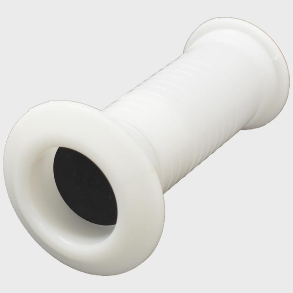 This adjustable thru hull scupper is constructed out of white polymer with black rubber scupper flap. The female portion of the scupper can be trimmed down by one rib for each 1/4" difference, and it fits hulls between 2" to 4 3/4" thick per manufacturer. It measures approximately 3" Dia. x 5 1/2" L overall and requires an approximate 1 7/8" Dia. cutout. See photos for additional measurements.