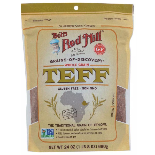 Reasons to our Gluten Free Teff: Non-GMO Project verified; nongmoproject.org; Gluten free; kosher. Tested and confirmed Gluten Free in our quality control laboratory. An employee-owned company. To your good health - Bob Moore. Grains-of-discovery. Bob's Red Mill passport to whole grain adventure. Circa. 5000 B.C. The traditional grain of Ethiopia. A traditional Ethiopian staple for thousands of years. Mild flavored and excellent in porridge or stew. Good source of iron. Dear Friends, At Bob's Red Mill, we're always in search of new whole grain adventures, and heirloom grains like teff are more popular than ever. This East African cereal grass originated in Ethiopia thousands of years ago and is the smallest grain in the world. Today, these super grains are prized for the delicious flavor and texture they add to salads, side dishes, entrees and baked goods.