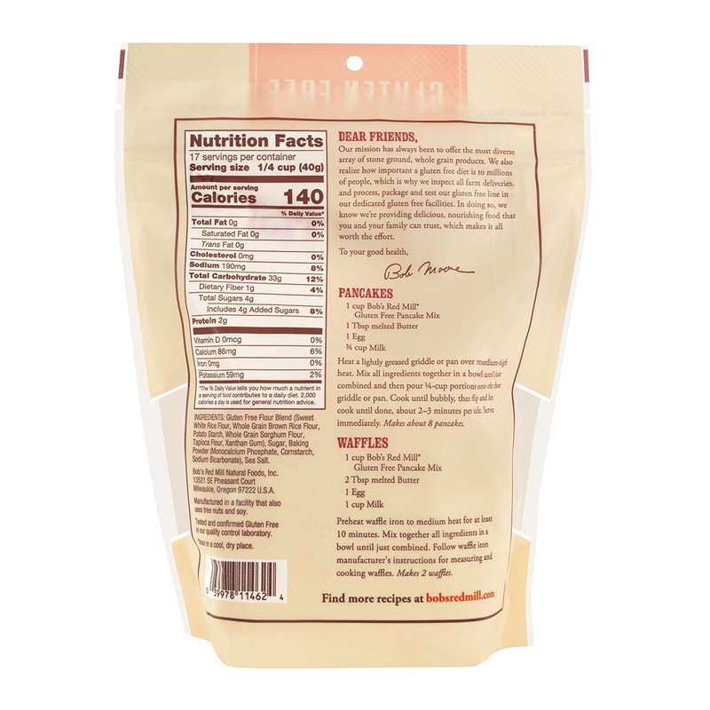 Rediscover Bob's Red Mill Gluten Free Pancake Mix, now completely refreshed with a brand-new recipe formula and beautiful new packaging! Major improvements to this mix to create gluten free pancakes that are fluffier, lighter and more delicious than ever before. Just add milk (use any kind that is suitable for your diet: soy, rice, coconut, almond or cow), butter or oil, and eggs. Then whisk, cook, flip and enjoy! Try adding blueberries, chocolate chips or a dash of cinnamon for a special treat.