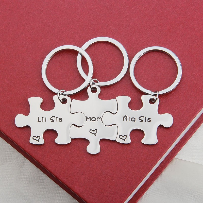 ♥This listing includes 3 keychains. Each keychains includes a stainless steel puzzle piece. Pieces are stamped with "Big Sis", "Mom" and "Lil Sis". Each piece hangs on an 1.18" diameter key ring.