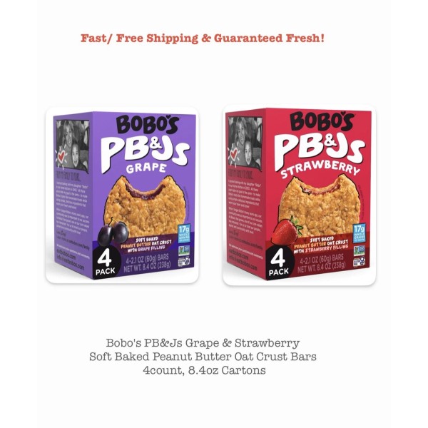 This listing is for a new, factory-sealed, guaranteed fresh by Bobo's PB&J, Grape & Strawberry Soft Baked Peanut Butter Oat Crust Bars - 2 Boxes (4 Count, 8.4oz Cartons). These items will be packaged securely and shipped via FREE USPS Ground Advantage and tracking number will be provided within 24 hours of cleared payment (please allow up to 72 hours on weekends and holidays). Multiple orders may be combined unless otherwise noted.