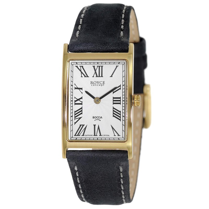 - Textured dial, Roman numerals, black hands, Bocce logo