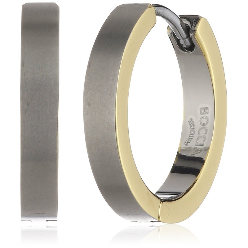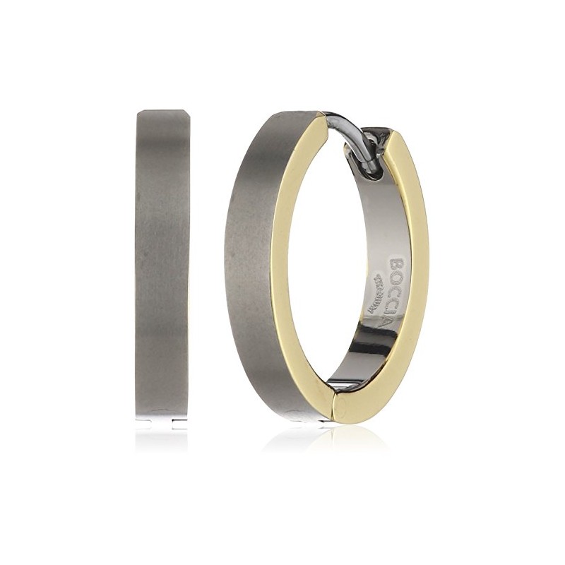 outstanding hypoallergenic pure titanium earrings, satined surface, polished and gold ion-plated sides, lasered logo, width 2,5 mm, outer diameter 14 mm, in Boccia gift-box