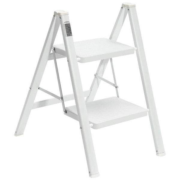 BOCOM 2 Step Ladder, Lightweight Portable Foldable Collapsible Folding Sturdy Steel Metal Step Stool with Anti-Slip Wide Pedal, Heavy Duty 330 lbs Capacity, for Home, Kitchen, Closet, Adults, White