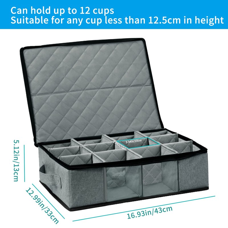 • 💦【COLLAPSIBLE AND PORTABLE】Dimensions are 13''D x 17''W x 5''H, with 12 padded compartments that each measure 4'' x 4''. Our storage organizer holds up to 12 cups or glasses that can be stored upright, sideways or upside down. These household mug storage containers can be foldable and easy carrying. When not use, you can fold it flat in order to save space. It is not only stylish, but extremely practical. With this coffee mug storage, you can easily take your mug and cup with you