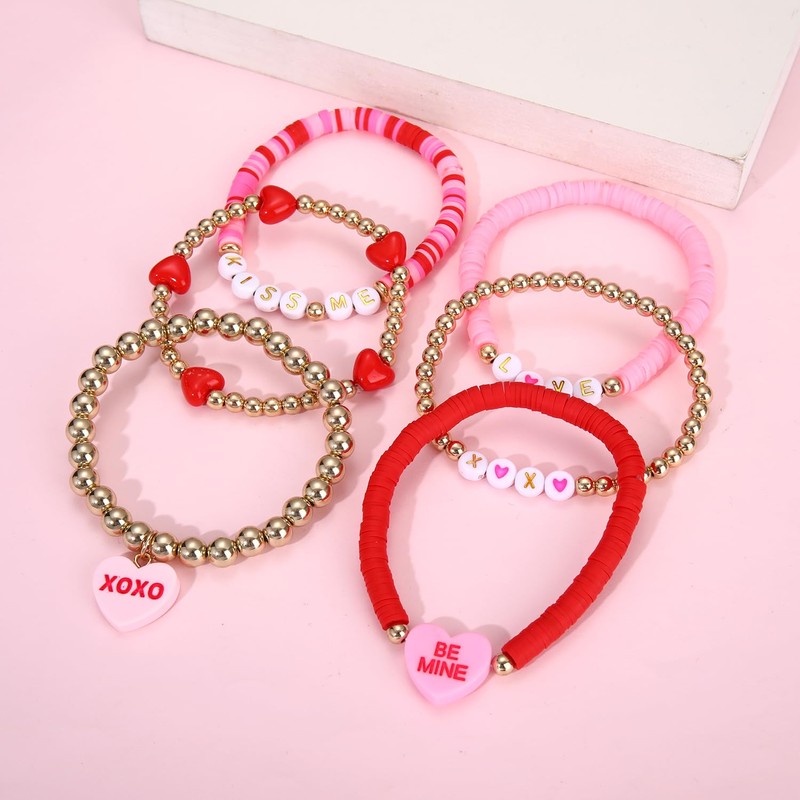 - Celebrate love in style with our exquisite set of 6 Valentines Bracelets for Women. These beautifully designed Valentines Day Bracelets showcase delightful pink and red clay intertwined with elegant gold beaded accents, capturing the very essence of romance. With their eye-catching colors and intricate details, these Valentines Bracelets Bulks are the perfect accessory to express your feelings on this special day—ideal for gifting or wearing as a reminder of love.