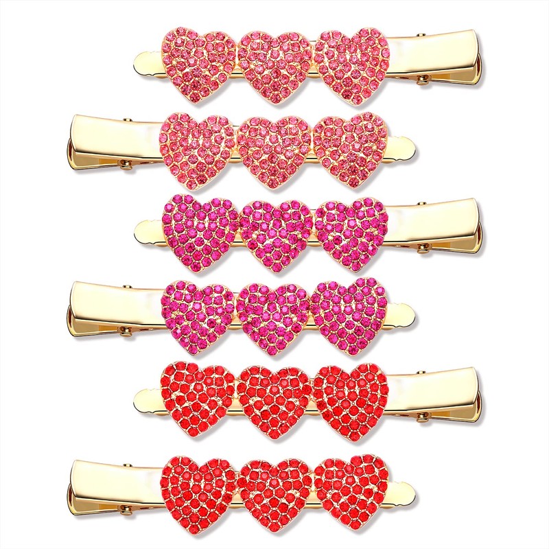 - Todo el mundo sentirá el amor cuando te vean usando este adorable juego de 6 pinzas de pelo de corazón. Cuenta con una fila de tres corazones pavimentados súper brillantes en un clip de cocodrilo de alto pulido. Incluye dos en cada color: rosa, rojo y fucsia. Usa unos pocos juntos o solos, seguro que pondrá tu glamour.