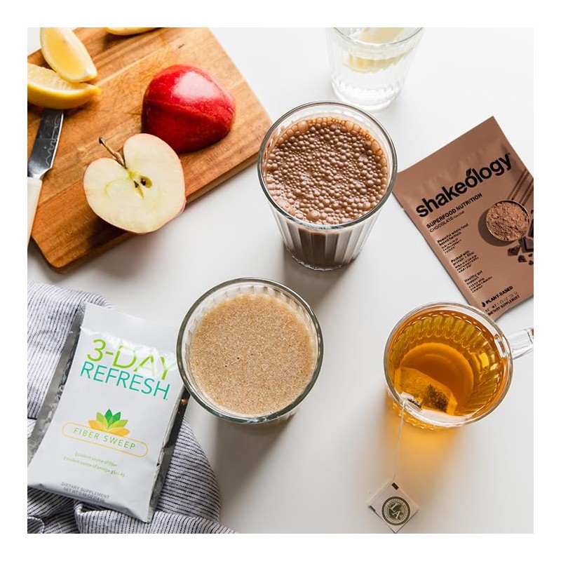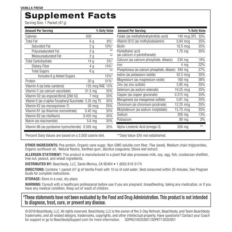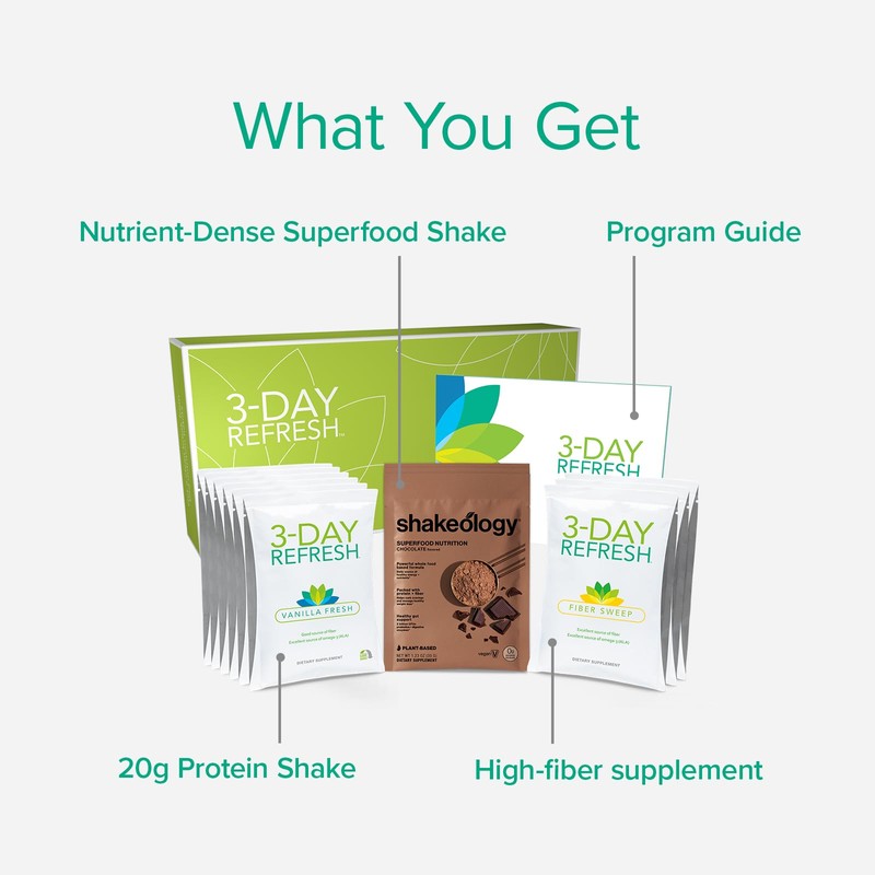 Jump-start your health and wellness journey with the 3-Day Refresh Complete Kit by BODi. This comprehensive program is designed to help you shed a few pounds, break bad eating habits, and feel revitalized—all without giving up food. Perfect for those seeking a quick yet effective cleanse, the 3-Day Refresh kit includes everything you need to help you feel cleaner, lighter, and healthier in just three days. Start your mornings with Shakeology, a nutrient-dense shake packed with superfoods to support key body functions and provide healthy energy. For lunch and dinner, enjoy Vanilla Fresh, a delicious protein-rich shake that provides 20g of plant-based protein, essential vitamins, minerals, omega-3s, probiotics, and fiber. To gently eliminate waste, incorporate Fiber Sweep into your daily routine—a morning fiber supplement made with a blend of flax and psyllium seed husk. The 3-Day Refresh Complete Kit also comes with a Program Guide, offering detailed meal plans, recipes, shopping lists, and tips to maximize your results. Additionally, a Maintenance Guide is included to help you maintain your new healthy habits, featuring clean eating principles, portion control, and advice for healthy dining out. Feel the benefits of a body cleanse with the 3-Day Refresh. Whether you're looking to cleanse for weight loss, improve your gut health, or simply reset your eating habits, this kit provides a structured and effective program. Experience the difference and embrace a healthier you with BODi's 3-Day Refresh Complete Kit.