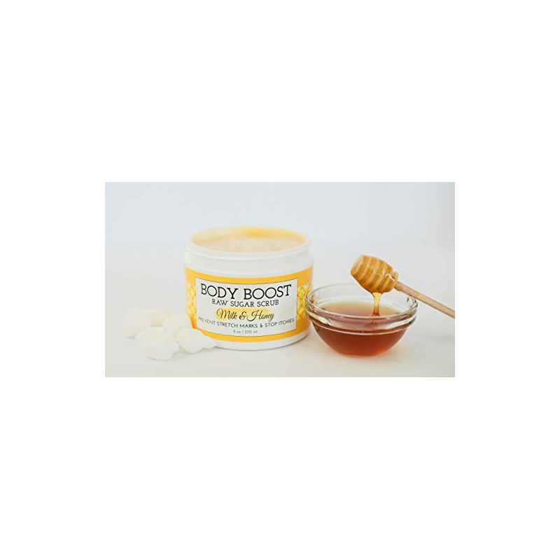Body Boost Milk & Honey Sugar Scrub 8 oz- Help Prevent Dry Skin, Stretch Marks, and Scars- Pregnancy and Nursing Safe- Allergen Free