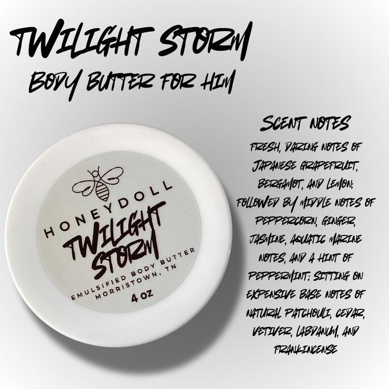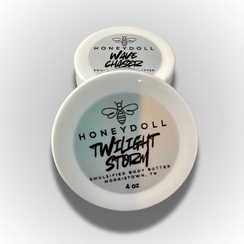 Honeydoll's Body Butters for Him are a must-have for any man who wants to keep his skin soft and smooth. These body butters come in two scents, Wave Chaser and Twilight Storm, and are available for purchase separately or together. Each jar is 4 oz in size and is made with a combination of shea butter, mango butter, avocado oil, jojoba oil, and vitamin E oil.