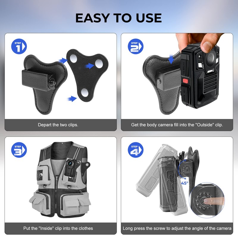 - 45° Degrees Adjustable for Body Camera :Magnetic clips support 45°adjust by press the Screw dot and rotate the plate. Which ake the camera lens slightly upward for a better recording effect. Suitable for people of any height.