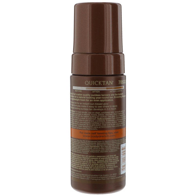 - SPRAY AND GO: Get a perfectly sun-kissed complexion in a matter of minutes! Body Drench Quick Tan Instant Self-Tanner Bronzing Mousse in Medium Dark is very easy to use! All you have to do is to exfoliate your skin for smooth application, spray evenly over your body holding 10" away, wash your hands once done, and let your skin dry before putting on clothes. For a deeper tan, use once a day until the desired perfect natural golden tan is achieved. To maintain tan, apply twice weekly.